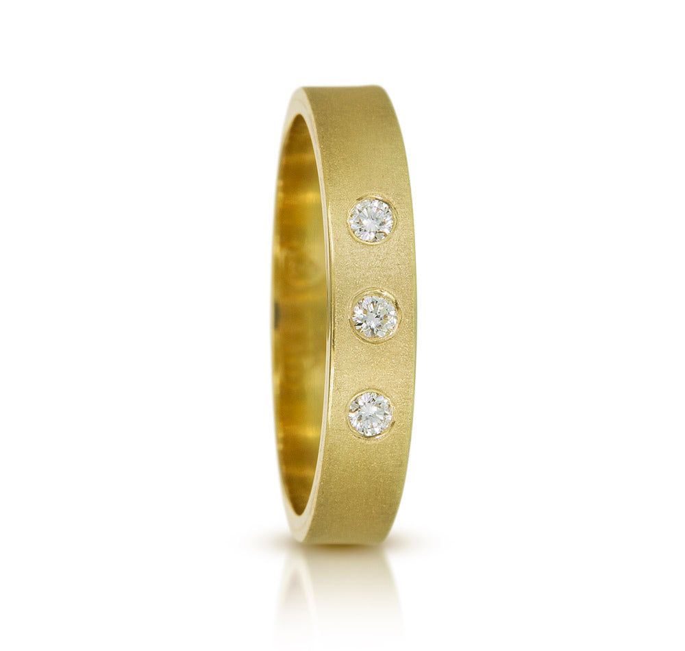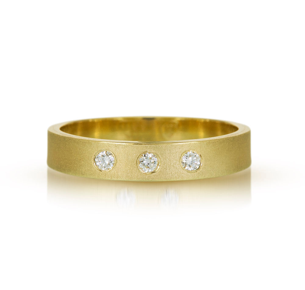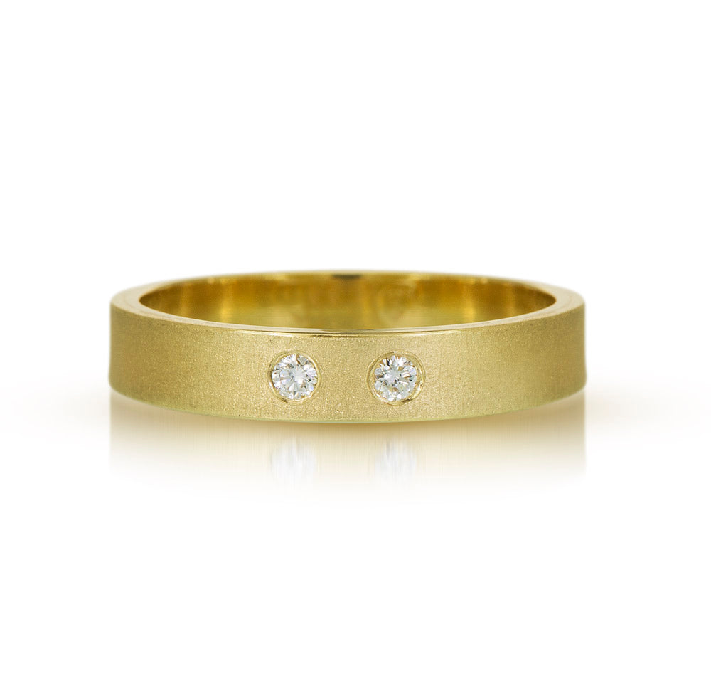 Each band features a beautiful sandblasted finish, offering a subtle matte texture, complemented by polished edges for a striking contrast that catches the light perfectly. These bespoke rings are more than jewelry—they’re a personal statement, where each diamond can symbolize milestones, loved ones, or cherished memories. More diamonds can be later added to track anniversaries and milestones.
