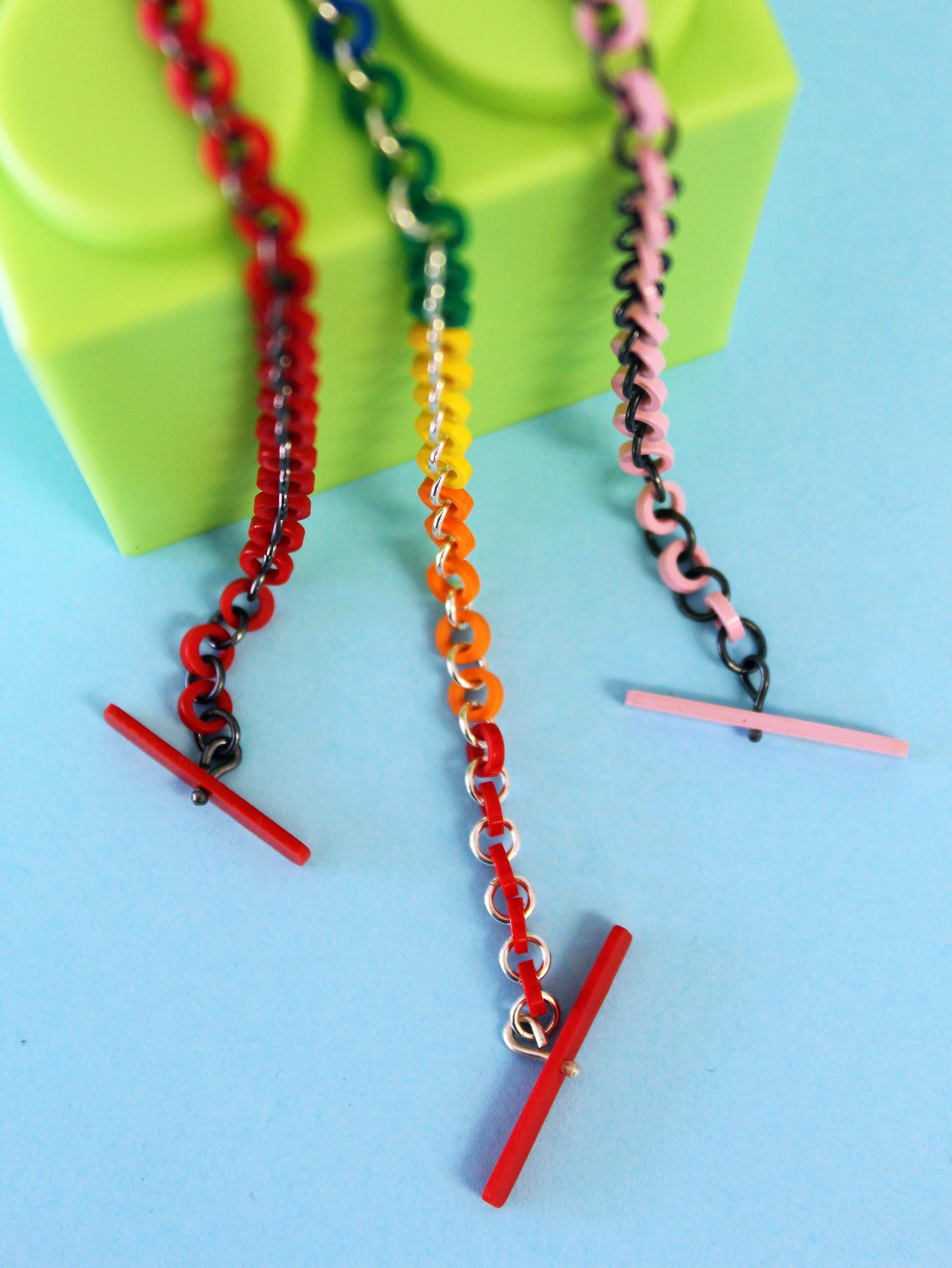 Lightweight, flattering, and full of joyful energy, this bracelet brings color and confidence to any look. It disguises the playful origins of each element, turning something familiar into something utterly unexpected. No one will ever guess what they’re made of.
