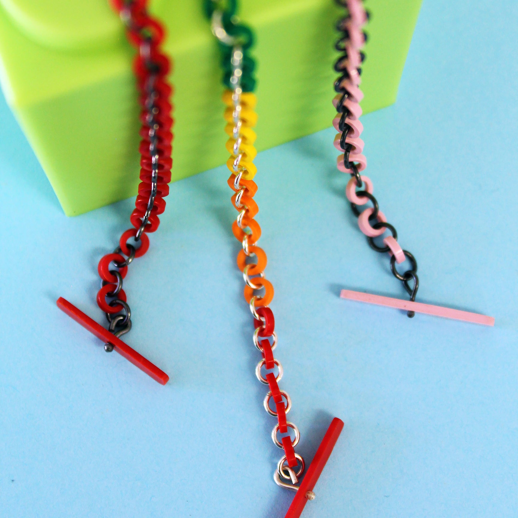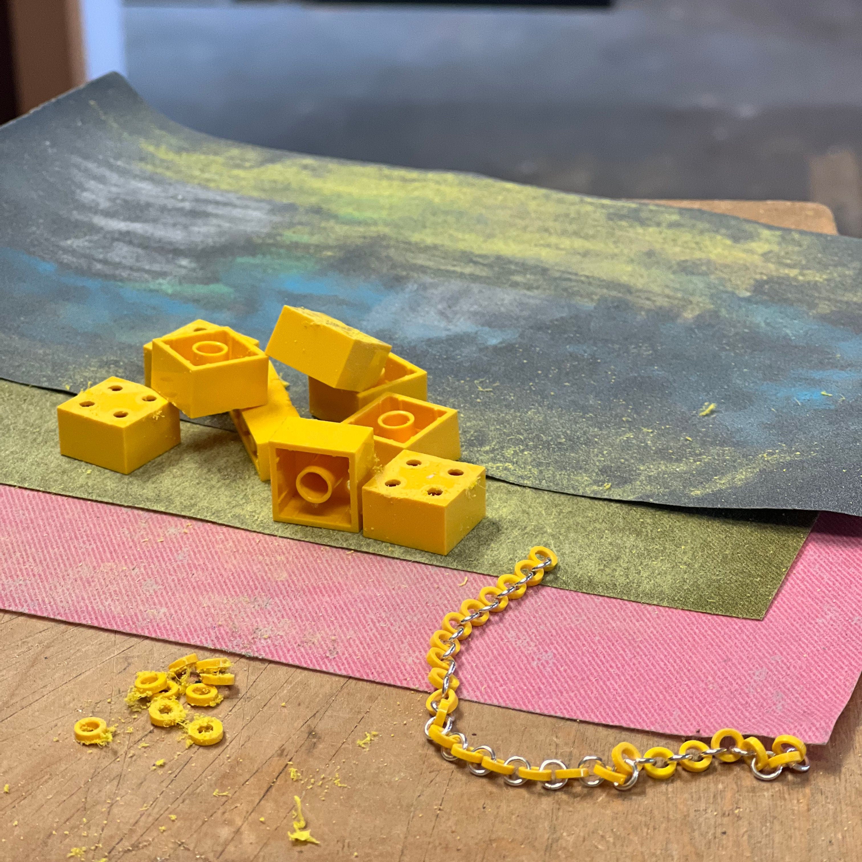 Elevate your style with the Cascade Bracelet, a one-of-a-kind piece handcrafted from recycled LEGO® studs and sterling silver. Each colorful link begins as a genuine LEGO® brick, meticulously transformed by hand—JacQueline drills, saws, and sands each stud with three grades of sandpaper to achieve a smooth, polished finish before connecting them with sterling silver jump rings.