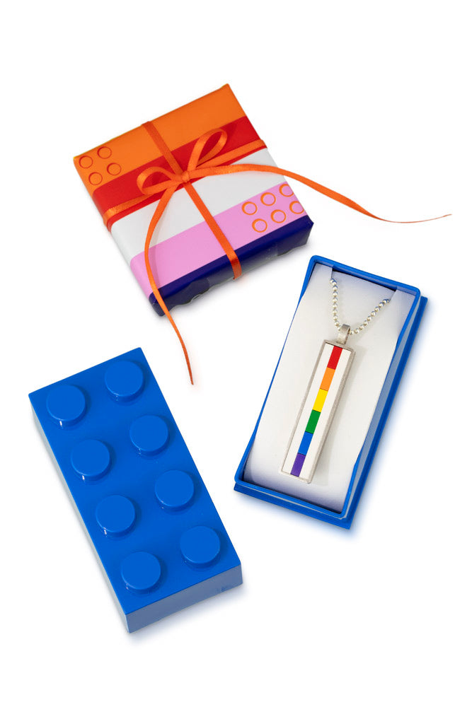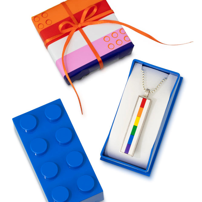 Add a bold pop of color and clever design to your jewelry collection with the Linear Rainbow Pendant – a modern, handcrafted necklace made from repurposed LEGO® bricks and sterling silver.