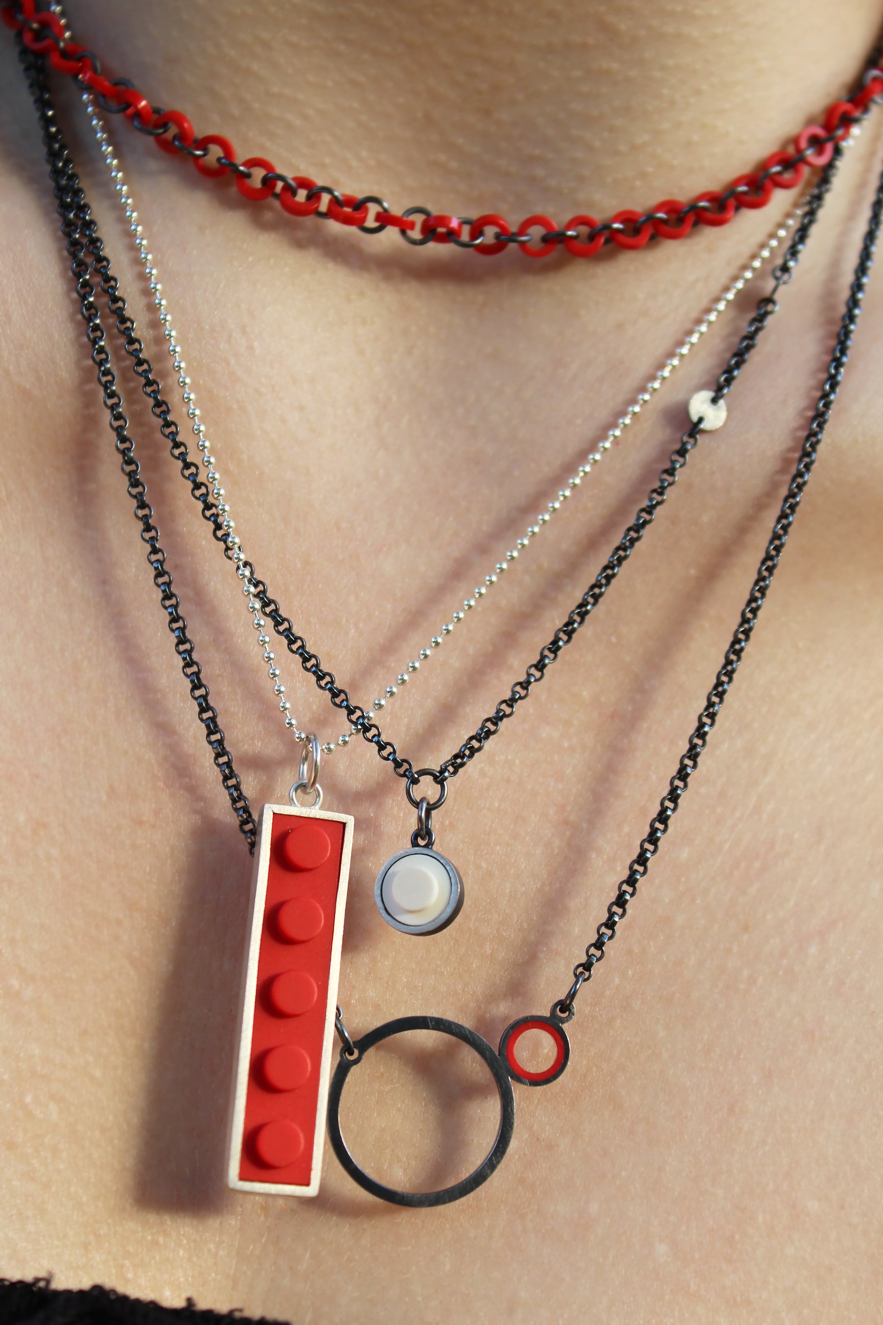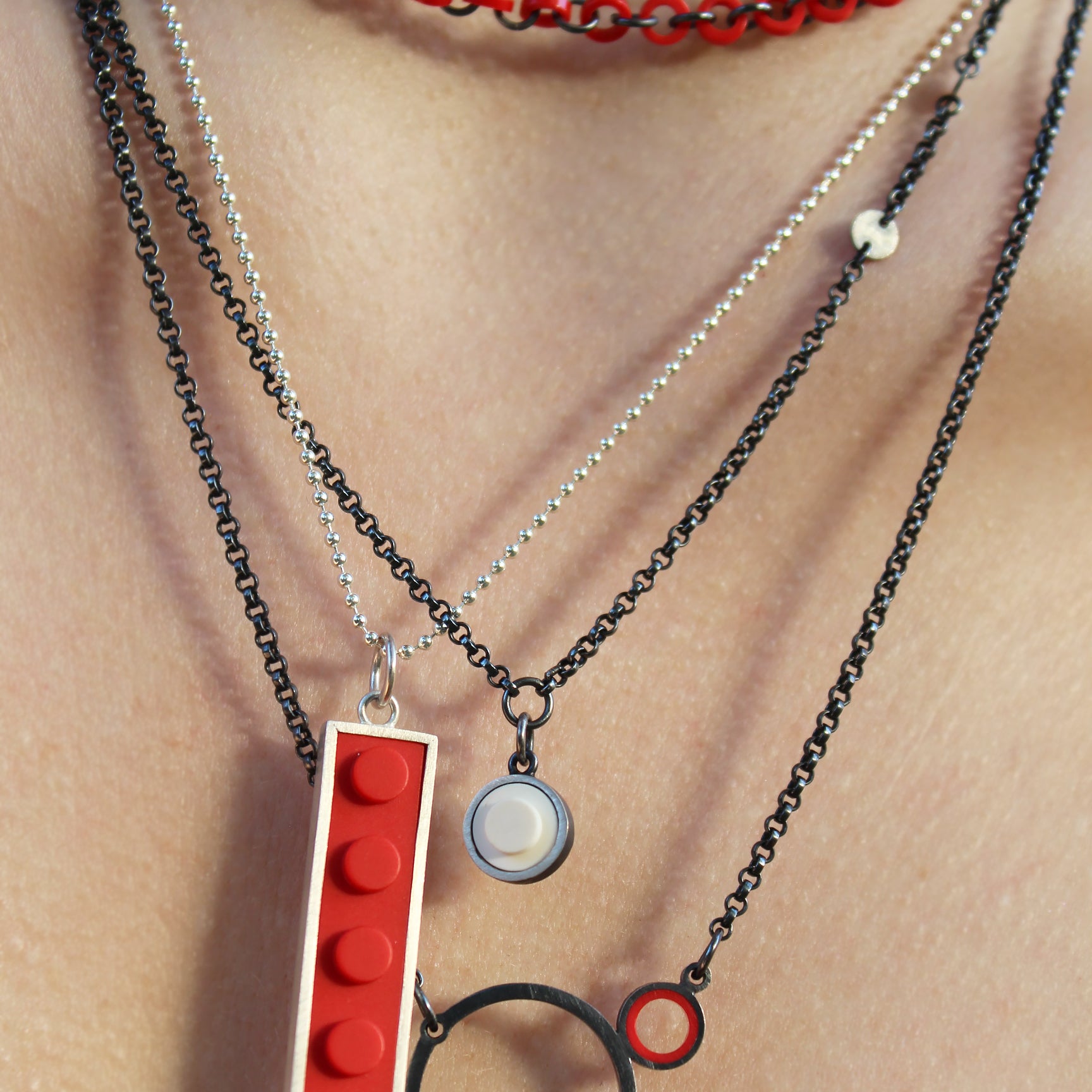 a necklace with a dark finish on the metal with a large circle pedant in center with a small circle attached to the side with a red recycled piece of a lego tube inside the small circle