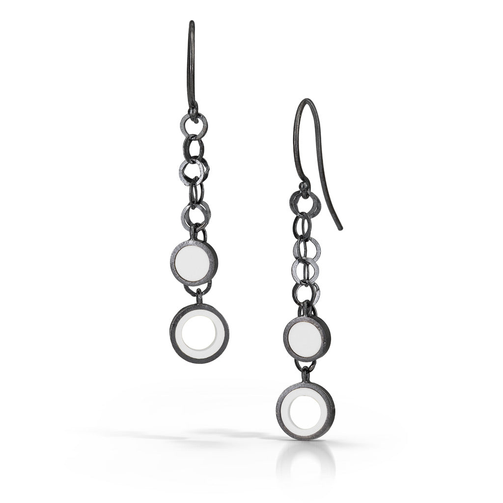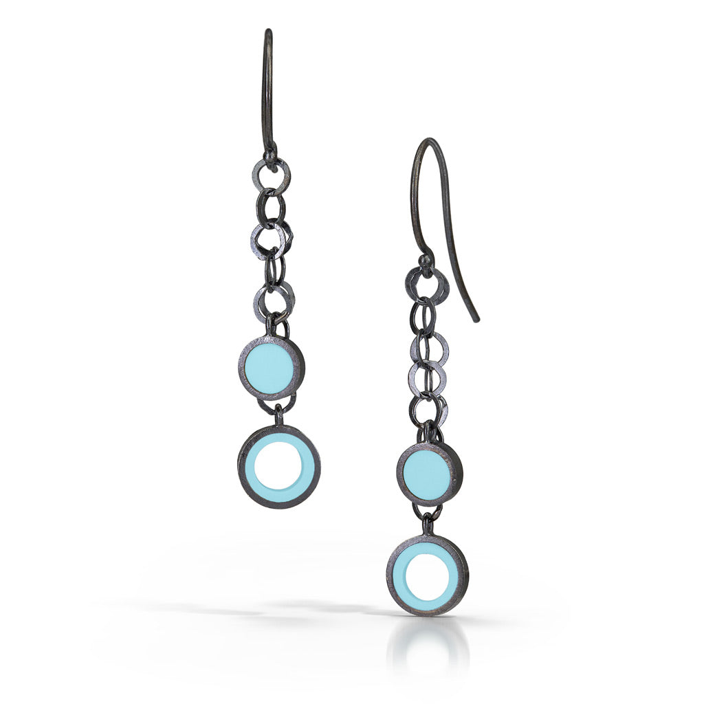 A spot of color against the gray or blue sky. That's a common sight around Portland, where murals, architecture, and outdoor art make up the landscape. These dangling stud earrings are reminiscent of that view and come in an array of colors to brighten your day.