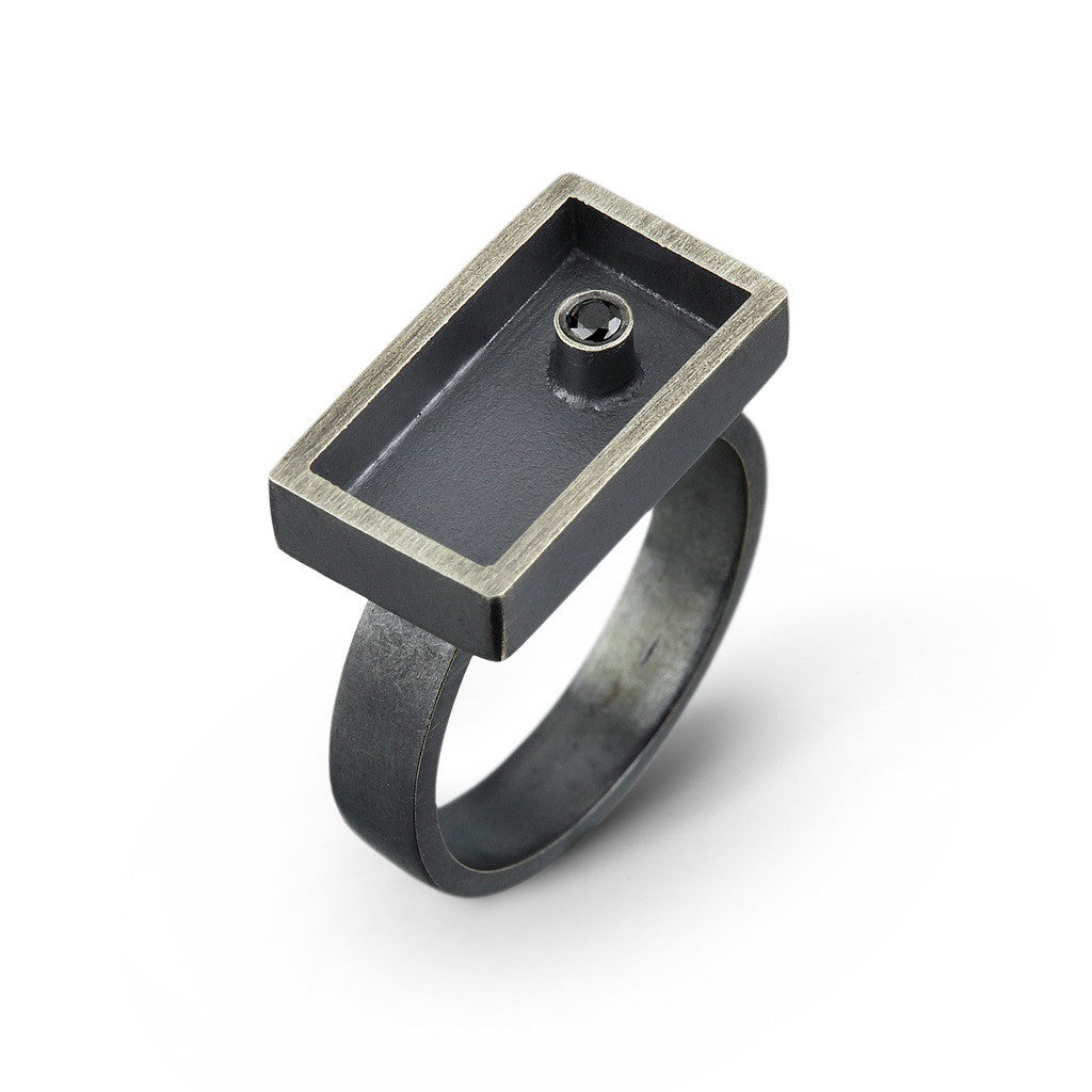 Handcrafted oxidized sterling silver with 3-pt black diamond.