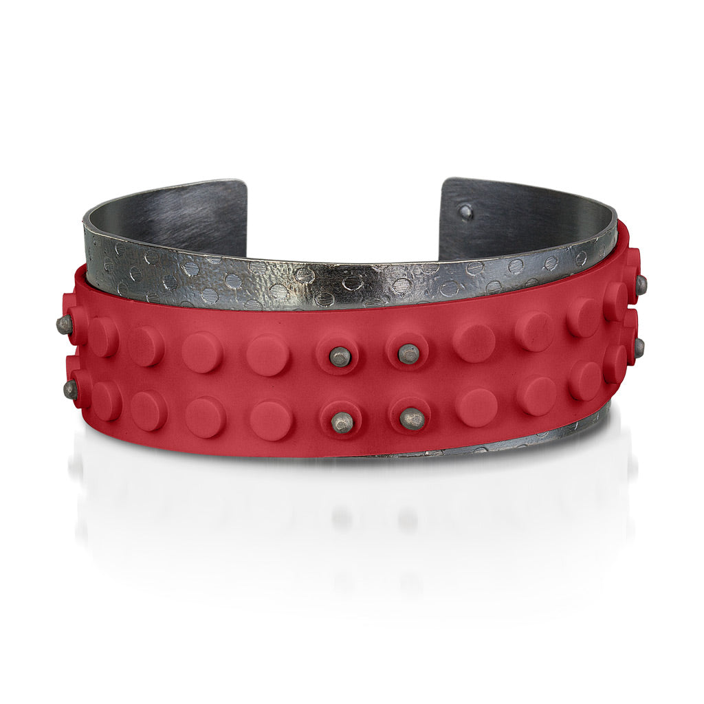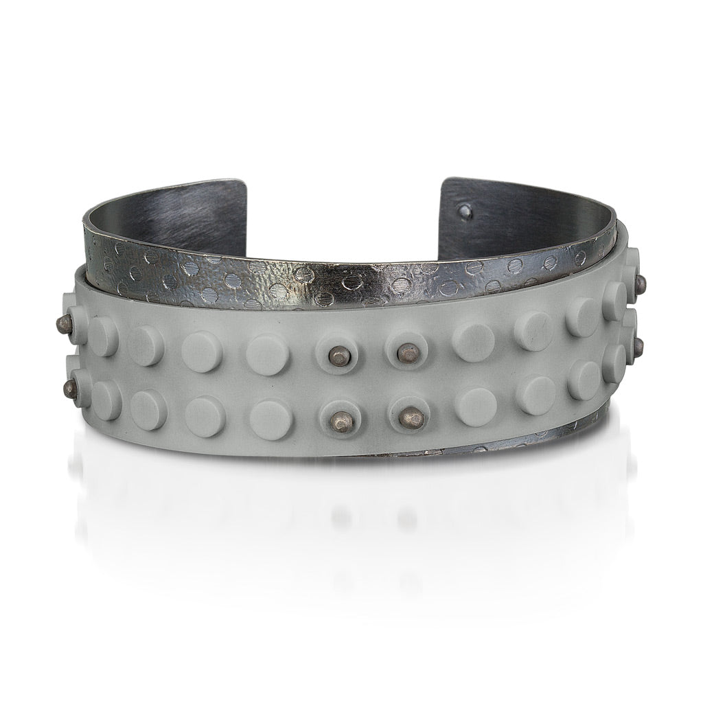 Photo-etched fabricated sterling silver with oxidized finish, sandblasted LEGO® plate with rivetsFits 7 1/2 - 8 inch wrist