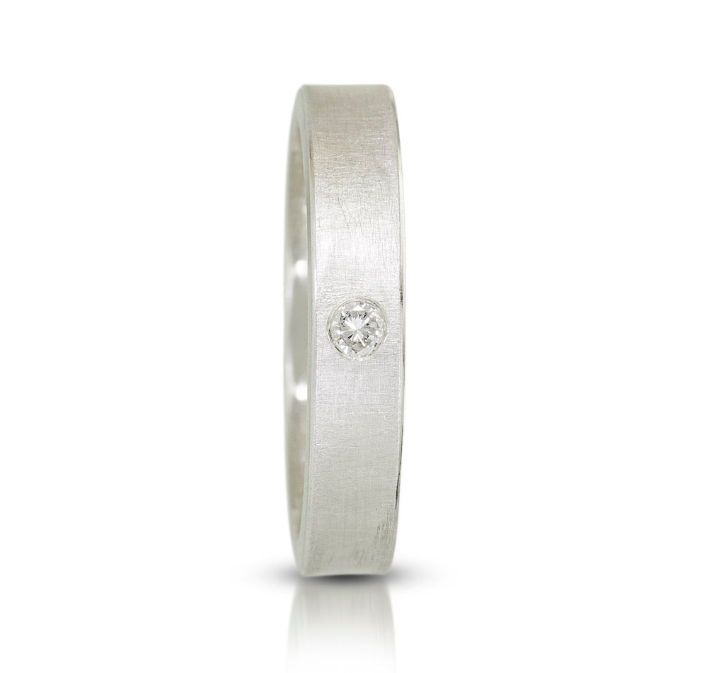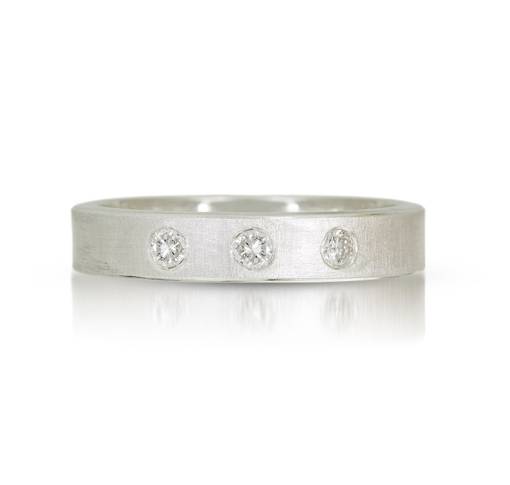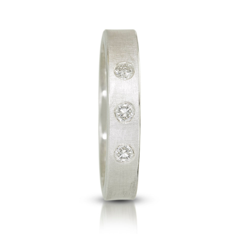 Each band features a beautiful sandblasted finish, offering a subtle matte texture, complemented by polished edges for a striking contrast that catches the light perfectly. These bespoke rings are more than jewelry—they’re a personal statement, where each diamond can symbolize milestones, loved ones, or cherished memories. More diamonds can be later added to track anniversaries and milestones.