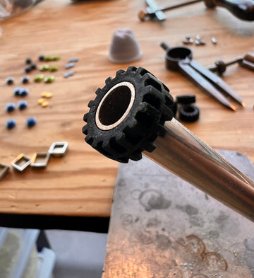 Back in the day, JacQueline's boyfriend was an ardent Grateful Dead fan and enticed her to travel with him around the country to see the band play. To pass the time while on the road, she took up making “dancing bear” earrings from sheet silver. Quickly hooked, she found herself selling every pair of earrings as fast as she could make them and saved her profits for college. Eventually, she studied at the Texas Institute of Jewelry Technology where she learned the fundamentals of jewelry design, fabrication, and stone setting.