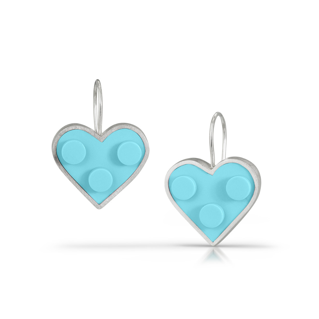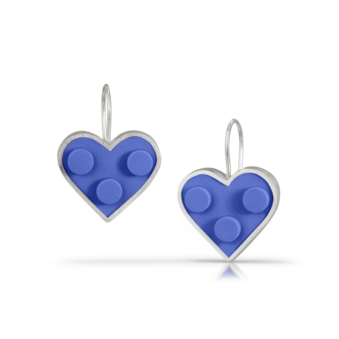 These heart earrings are hand cut from a 2 X 2 LEGO® brick to create a heart shape. Hand fabricated sterling silver bezels are created for each one. Every pair are one of a kind.