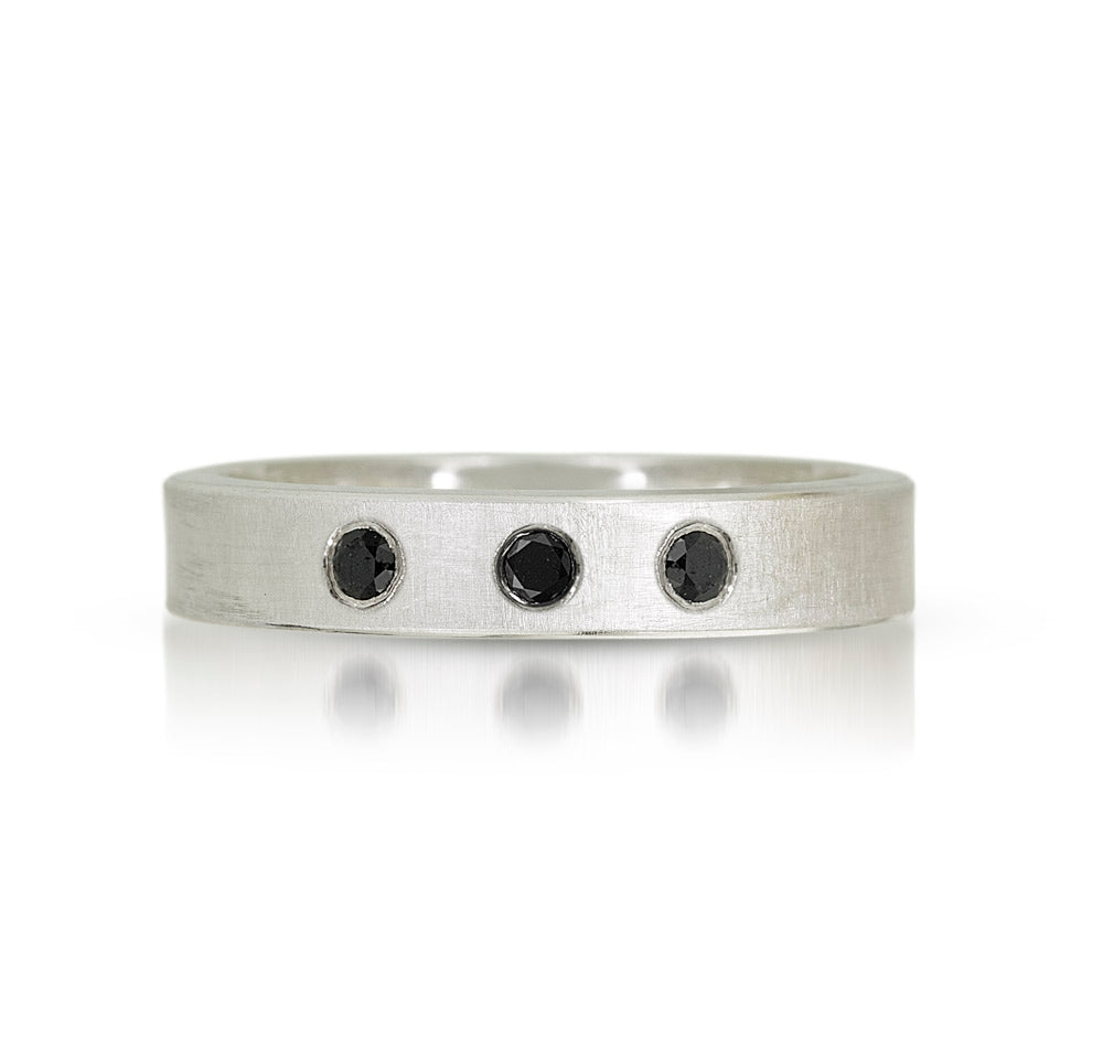 Discover the timeless elegance of our Hand-Fabricated Sterling Silver Diamond Bands, custom-crafted to celebrate your unique story. These stunning bands are adorned with black diamonds that can be tailored to your preference—whether you choose a single diamond, a trio of brilliance, or a shimmering circle of stones encircling your finger.